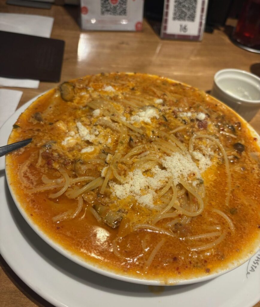 今回、粉チーズを追加したのでスープと麺が良く絡んで正解でした!