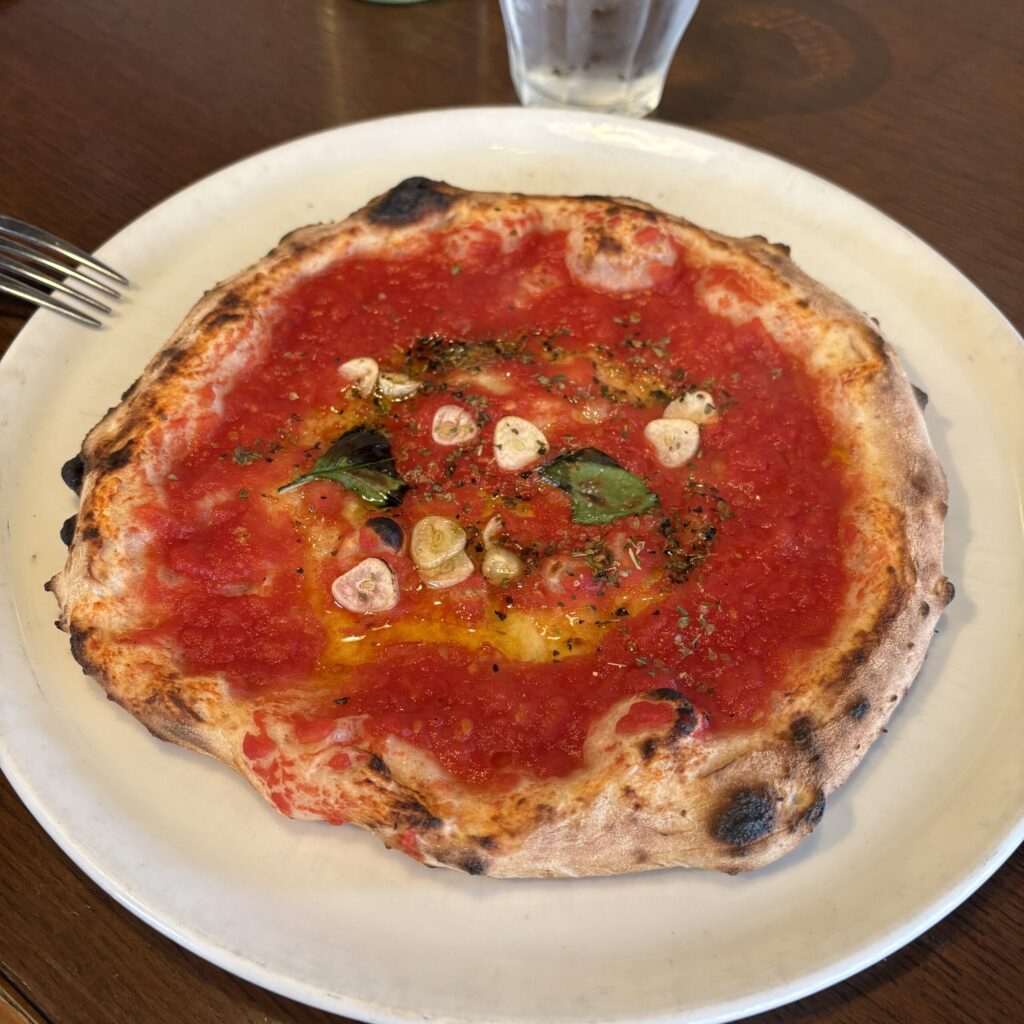 もちもちとした厚め生地にトマトソースがたっぷり。塩味の効いた生地にトマトの旨味と酸味が合わさって美味しい。ときどき口に入るニンニクやオレガノが味変になりますね。