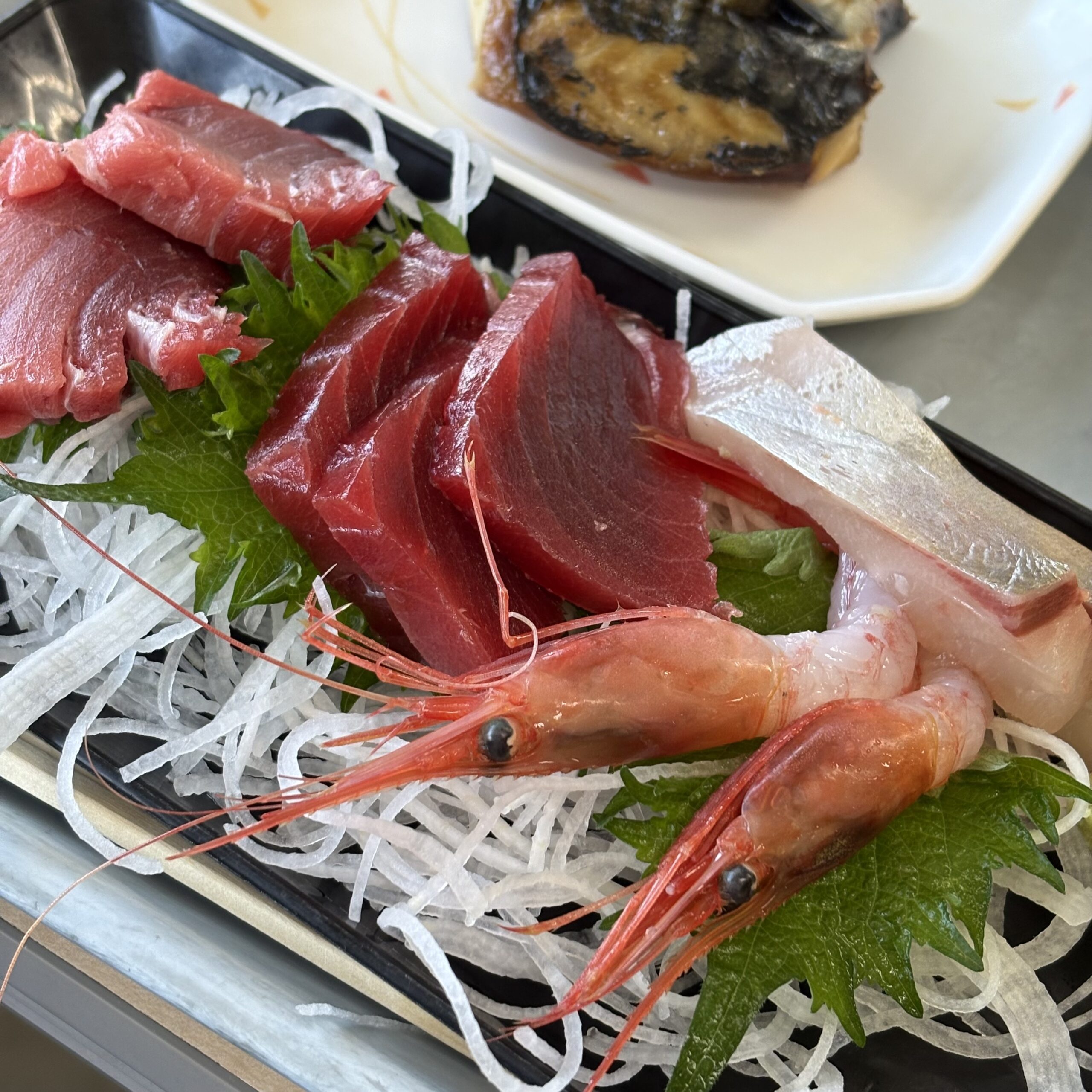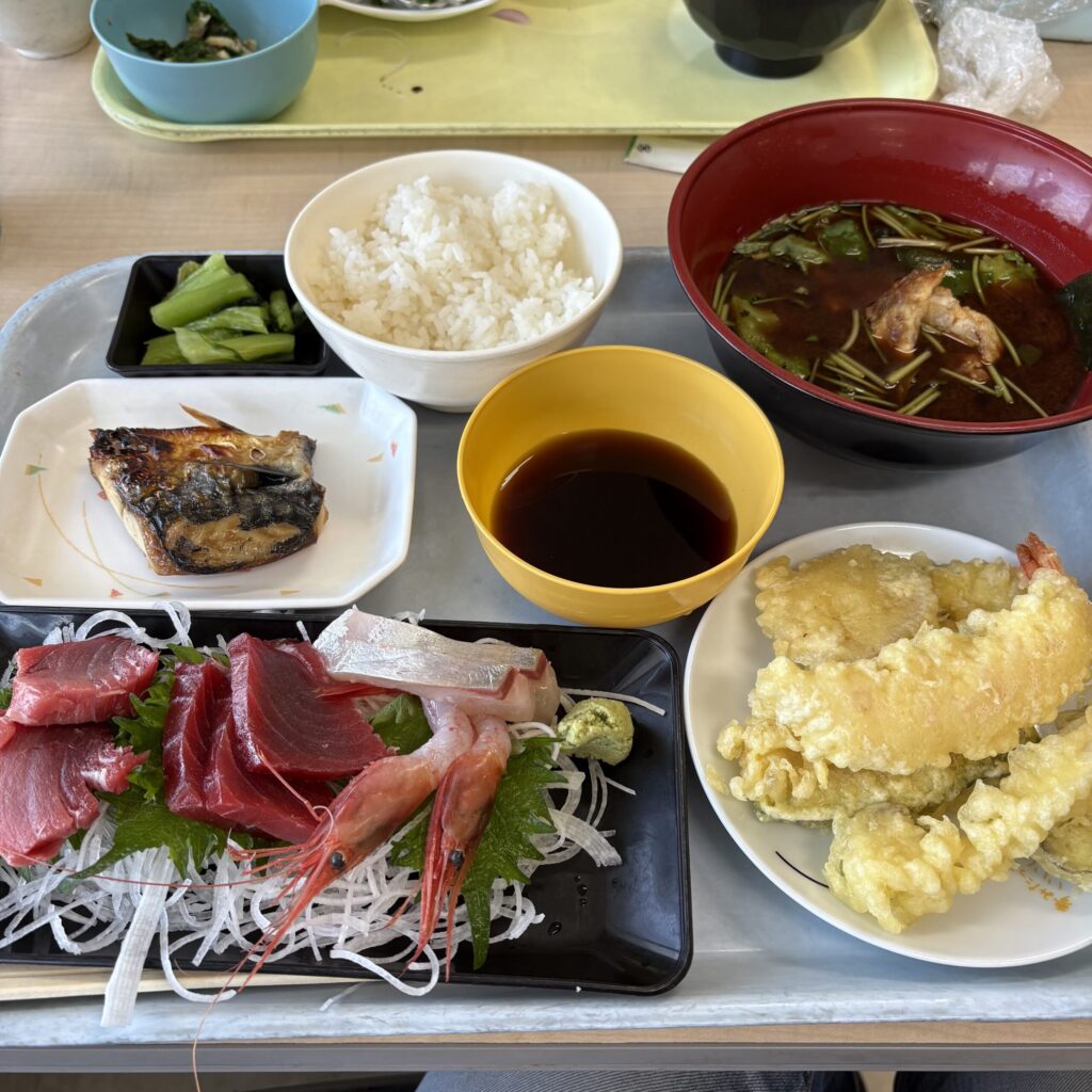 今日は、天然本マグロ刺身に天ぷら、鯖塩焼き、赤だしのついた1,600円定食を注文。